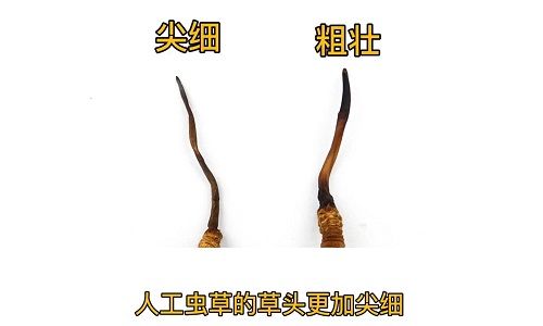 第一,人工蟲草的草頭更加纖細(xì)。