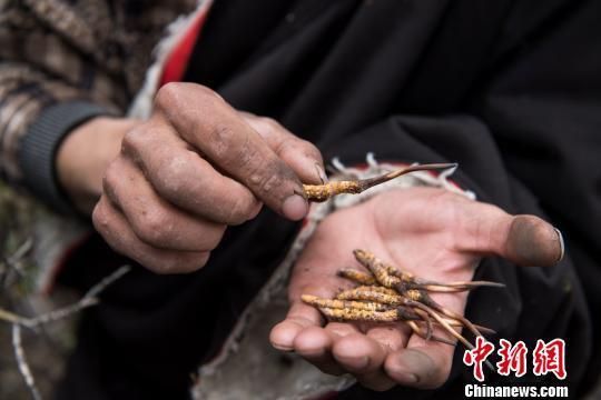 圖為近日,西藏農(nóng)牧民采挖到的蟲(chóng)草?!『闻罾凇z