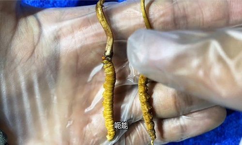 四、我們把這個兩根那個蟲草都掰斷了,有的人說就是網(wǎng)上說很多是人工的沒有消化腺,